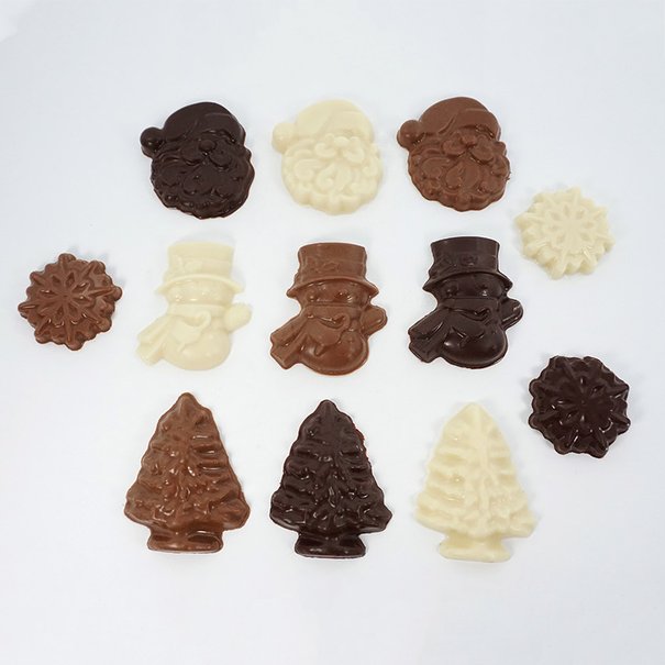 Dark chocolate : cocoa paste, sugar, cocoa butter, lecithin, vanilla flavouring. Milk chocolate : sugar, cocoa butter, milk powder, cocoa paste, lecithin, vanilla flavouring. White chocolate : sugar, cocoa butter, milk powder, lecithin, vanilla flavouring.