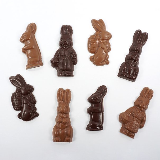 Dark chocolate : cocoa paste, sugar, cocoa butter, lecithin, vanilla flavouring. Milk chocolate : sugar, cocoa butter, milk powder, cocoa paste, lecithin, vanilla flavouring. White chocolate : sugar, cocoa butter, milk powder, lecithin, vanilla flavouring.
