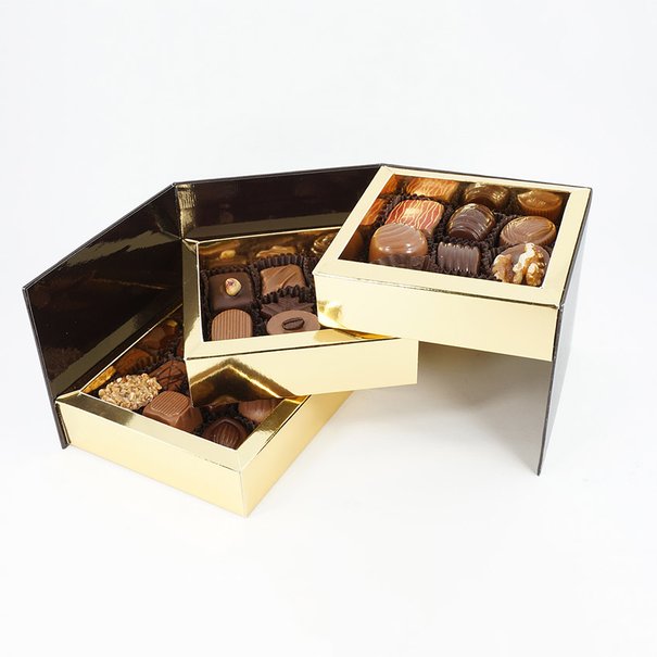 Assortiment de chocolats belge Heyez lait et noir. Déclinaison de pralinés, ganaches, caramel, petits fruits...