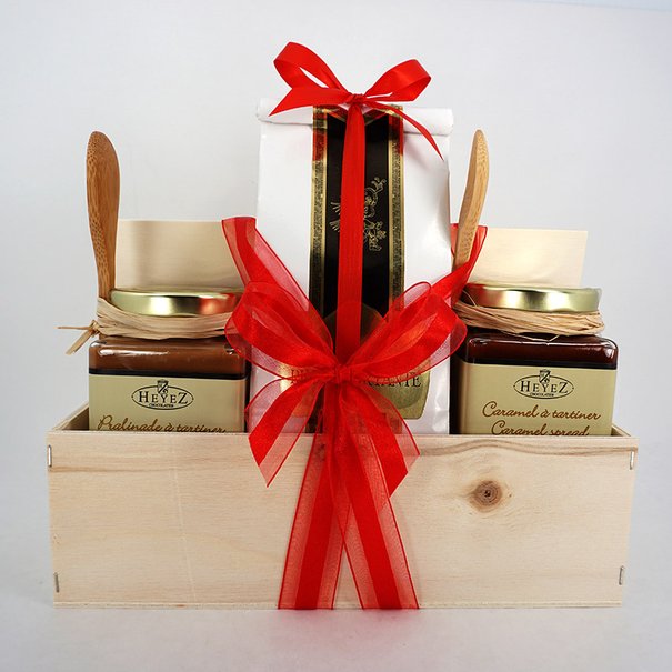 Le trio comprend une potion réconfortante (mélange chocolat chaud) un pot de Caramel à la fleur de sel et un pot de Pralinade noisettes à tartiner.